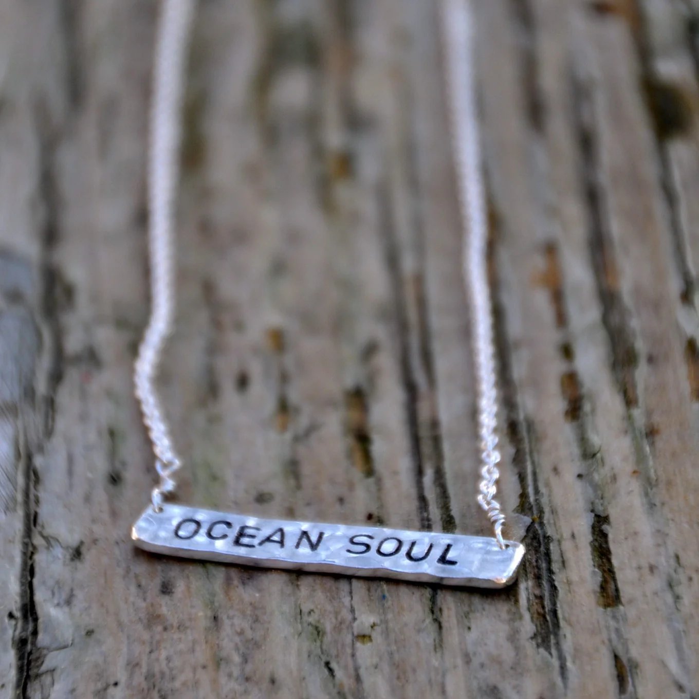 If your heart belongs to the sea this necklace is perfect! Hand made, stamped and hammered sterling silver with a patina finish in the lettering to contrast with the silver. The pendant is hung from a 16" or 18" sterling silver chain. Made in Wellfleet, MA.