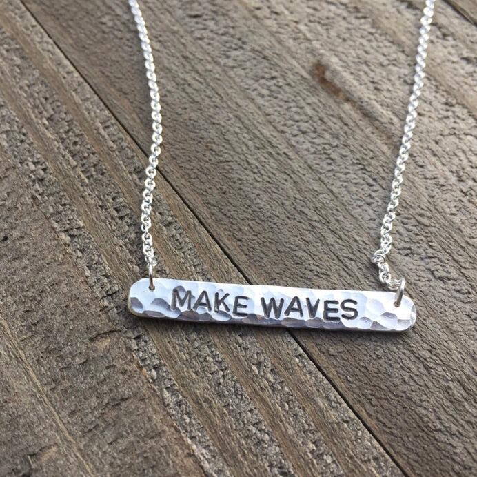 You can find inspiration in this necklace when you wear it by remembering to always Make Waves! Or you can show your love for the ocean! Hand made, stamped and hammered sterling silver with a patina finish in the lettering to contrast with the silver. The pendant is hung from a 16" or 18" sterling silver chain. Made in Wellfleet, MA.