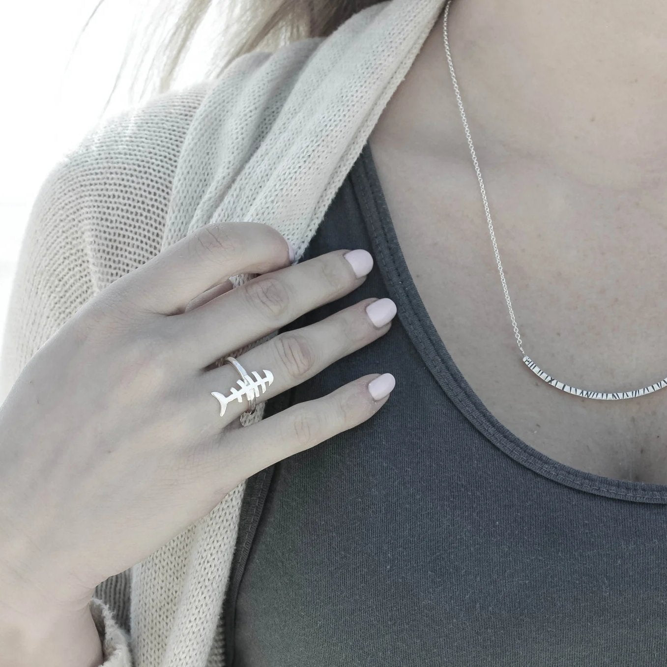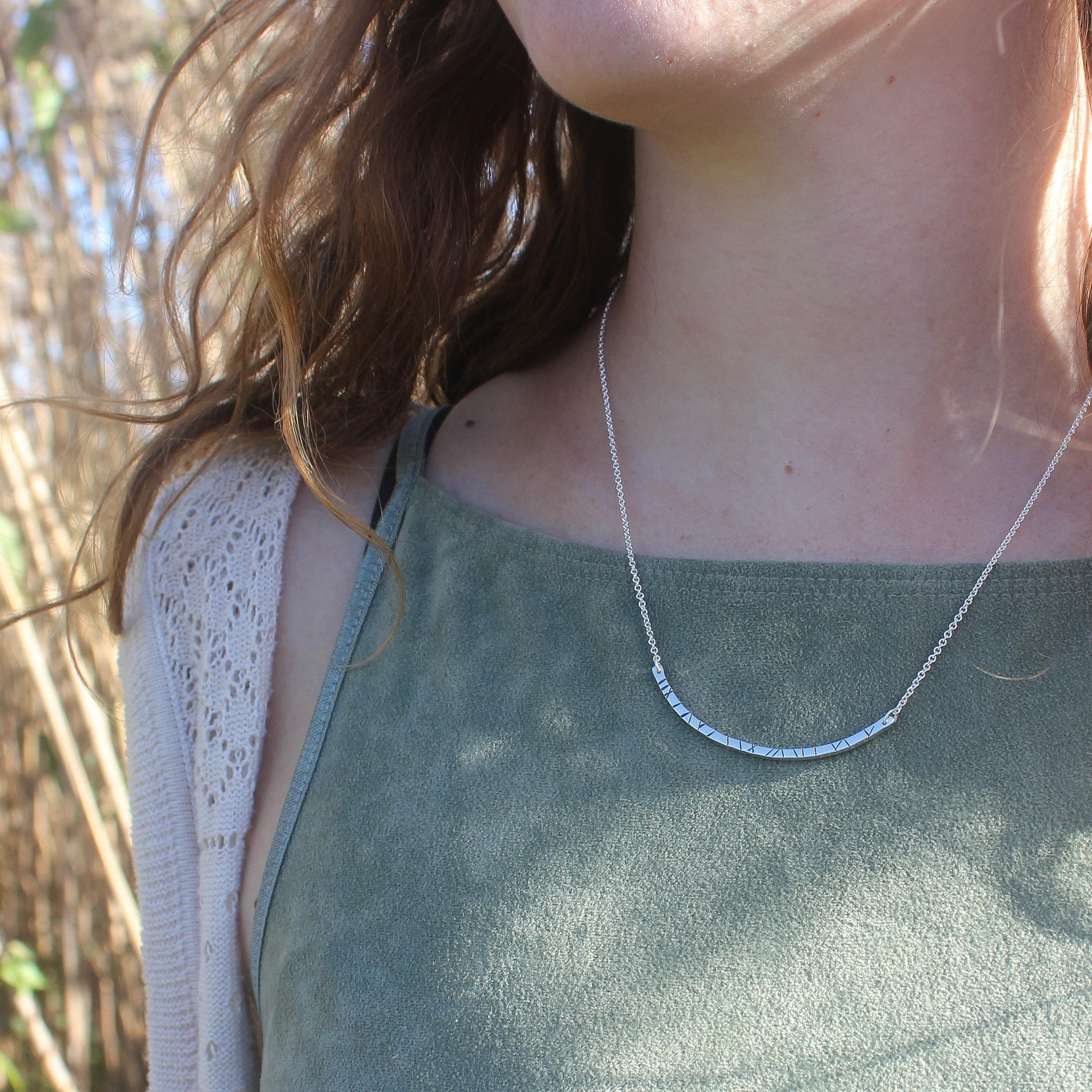 This necklace features a curved bar with unique markings stamped across it to create a totally different pattern on every piece! The Argentium Silver bar is 3" in length and hung from a 16" or 18" sterling silver chain. Handmade in Wellfleet, MA.