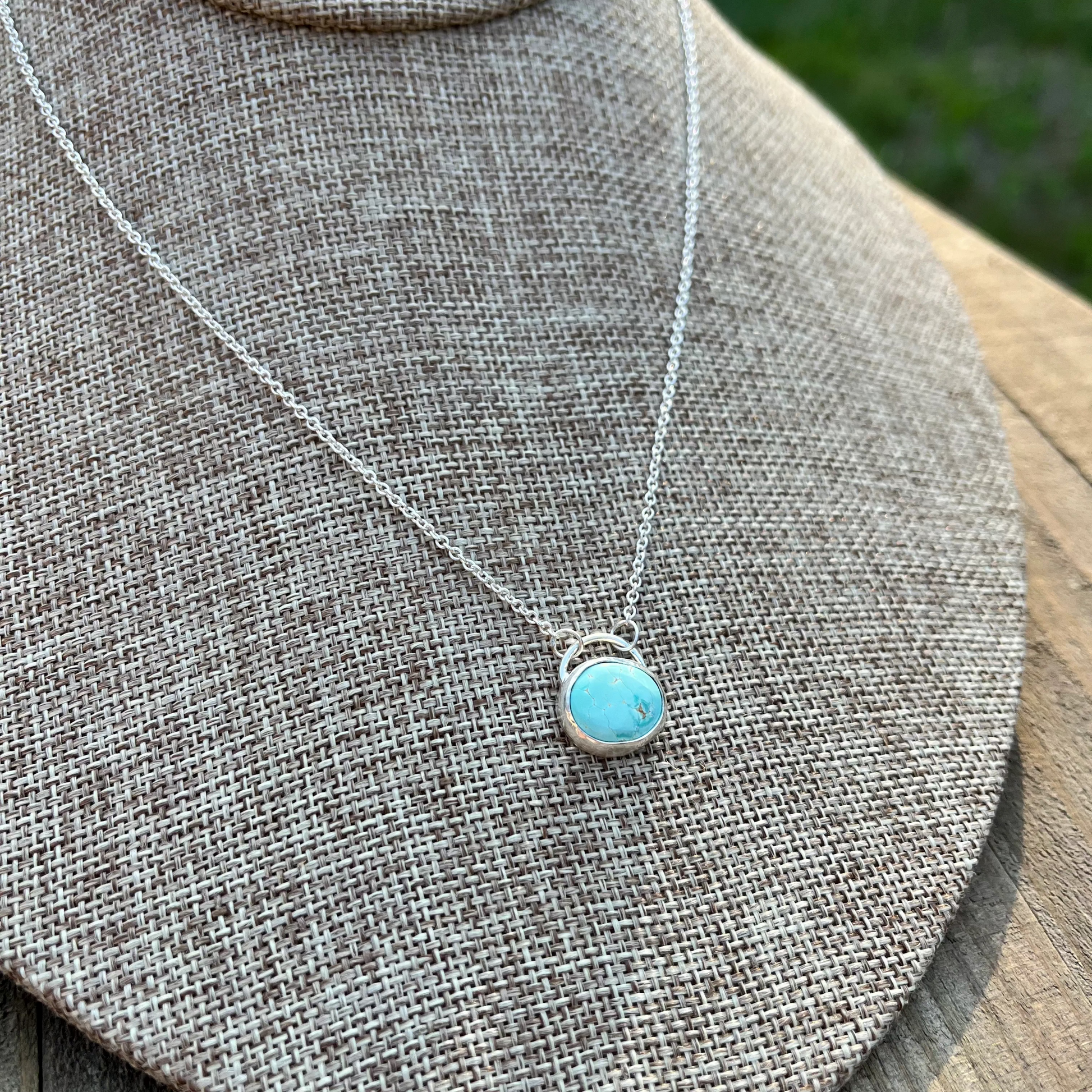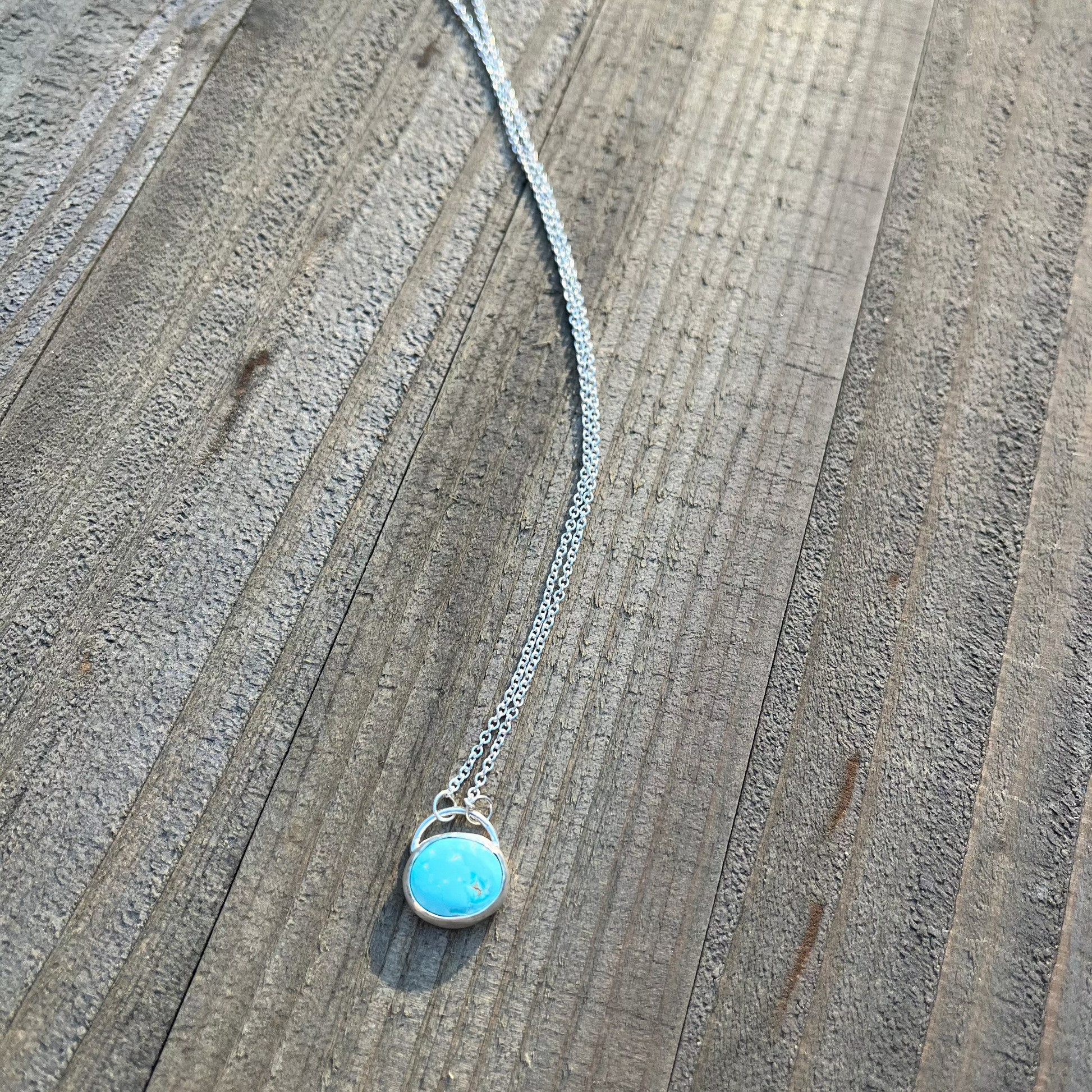 This one of a kind turquoise necklace is ready to ship! A beautiful shade of aqua on this cabochon makes this necklace pop. Its simple yet elegant, set in sterling and fine silver and hung from an 16” sterling silver chain. Handmade in Wellfleet, MA by Danielle Benton.