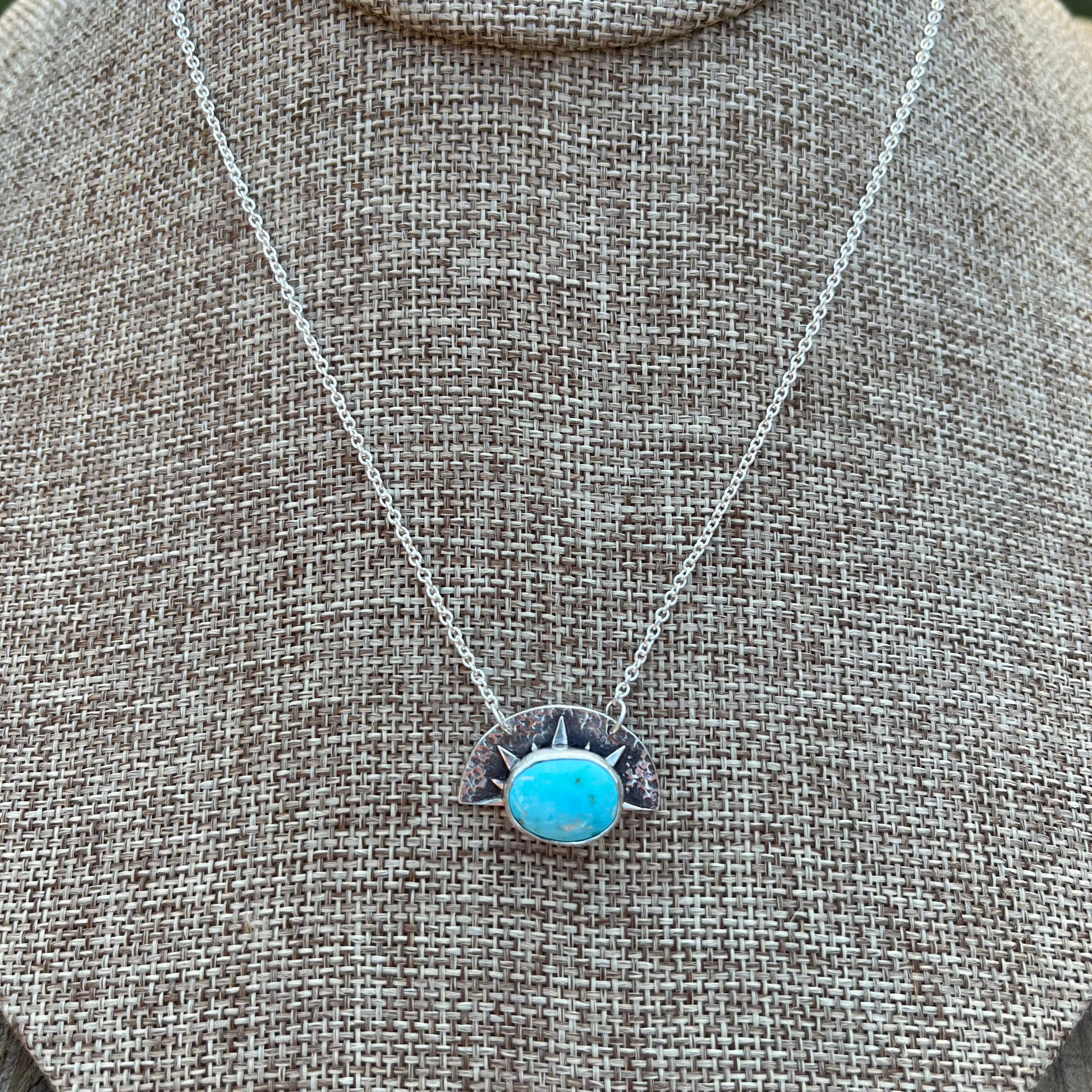 This Sunrise XL pendant has a beautiful turquoise cabochons set in sterling and fine silver on it. The pendant is hung on an 16” sterling silver chain. Handmade in Wellfleet, MA by Danielle Benton. This necklace is ready to ship.