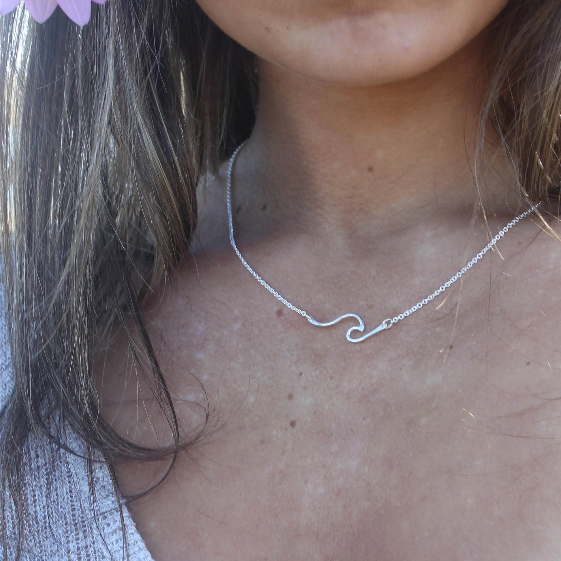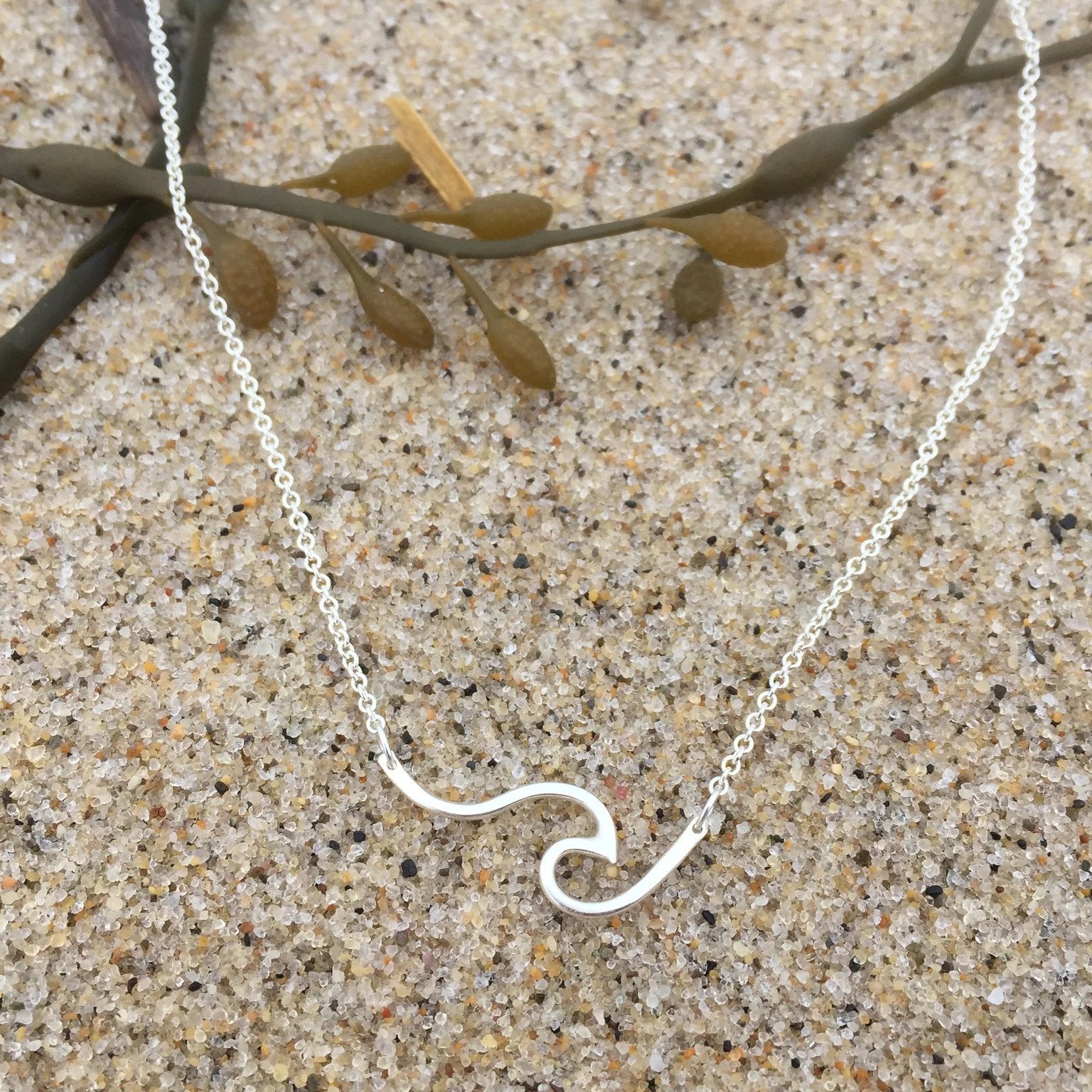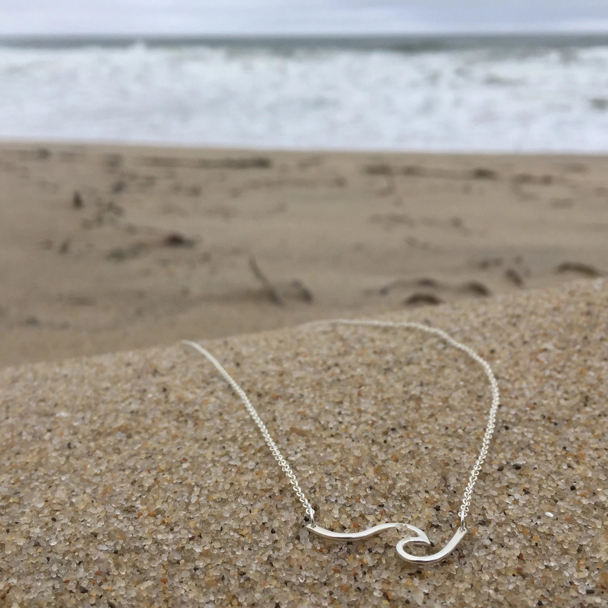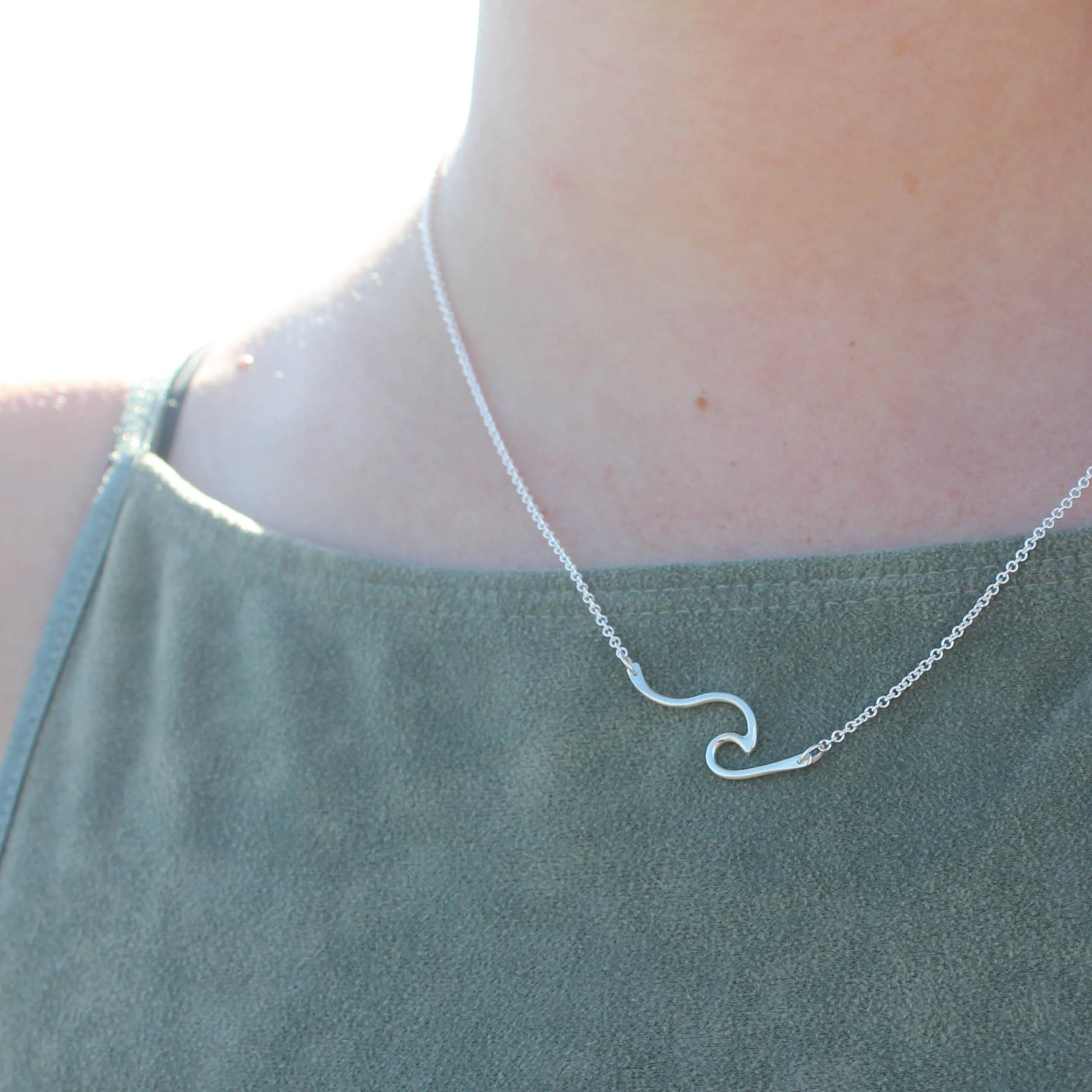 A tiny, more simplistic version of the Bar Wave Necklace measures under an inch across and can be hung from a 16" or 18" sterling silver chain. Sterling silver, Hand made in Wellfleet, MA.