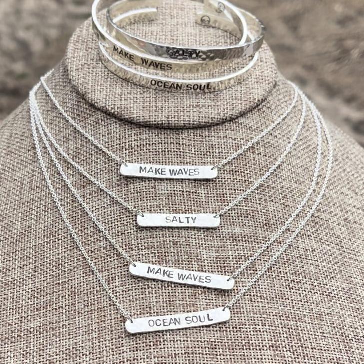 Love being salty? This design is intended to show off your love for the ocean! Hand made, stamped and hammered sterling silver with a patina finish in the lettering to contrast with the silver. The pendant is hung from a 16" or 18" sterling silver chain. Made in Wellfleet, MA.