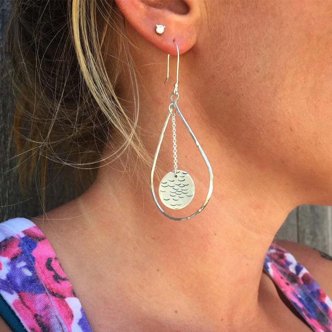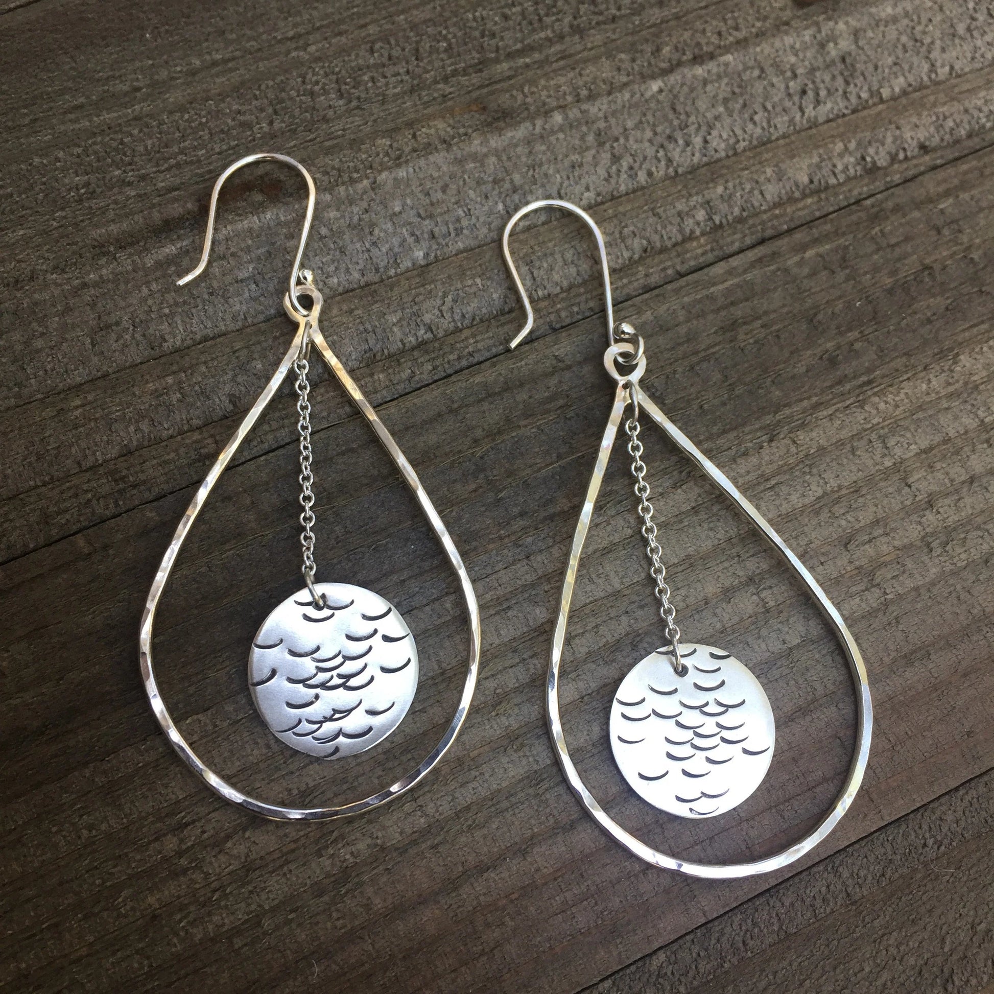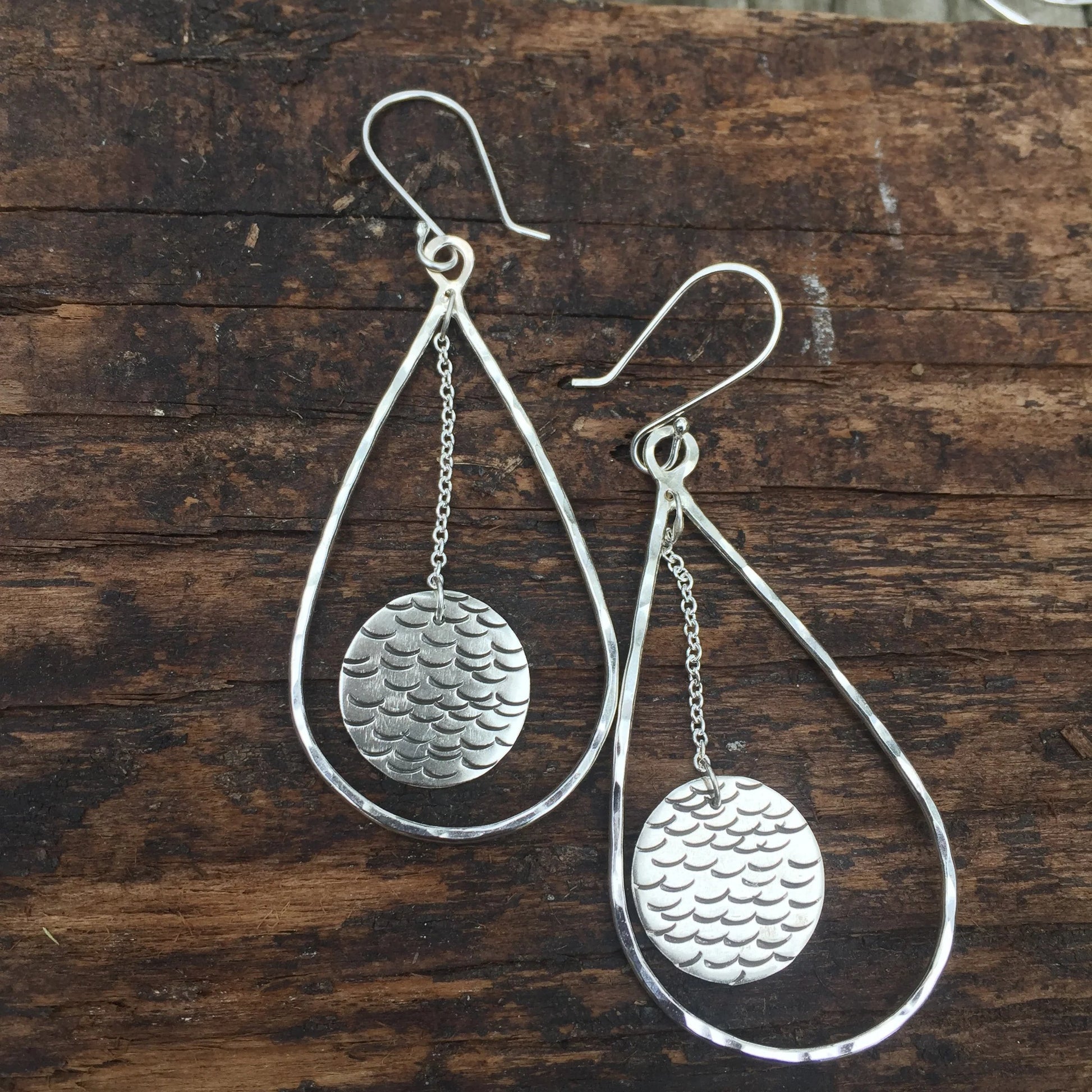 These light and flowy earrings are made with *Argentium silver tear drop hoops hung with sterling silver discs with a scale texture hand stamped on them. The discs are hung from pieces of sterling silver chain and the earrings measure about 2 1/4” long!