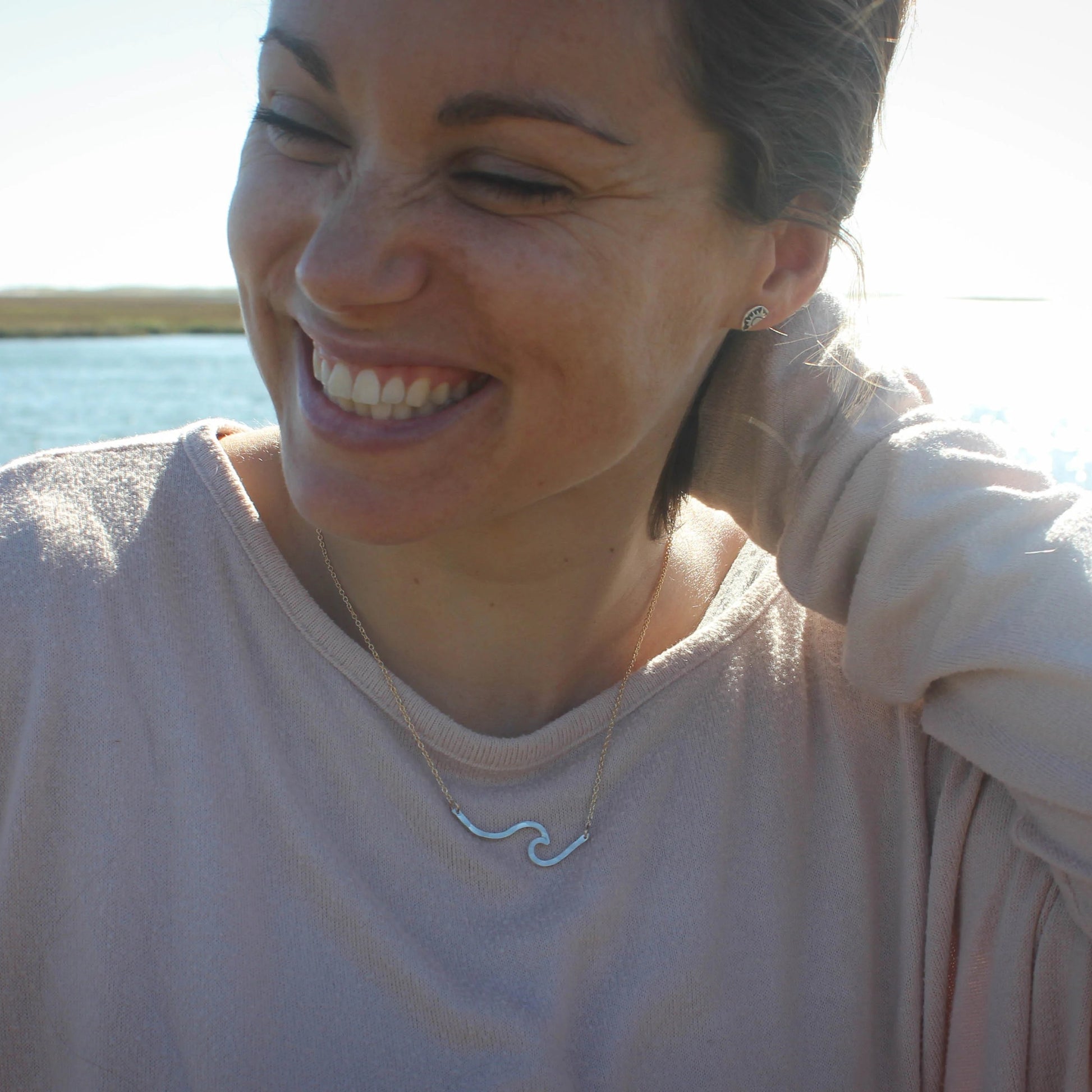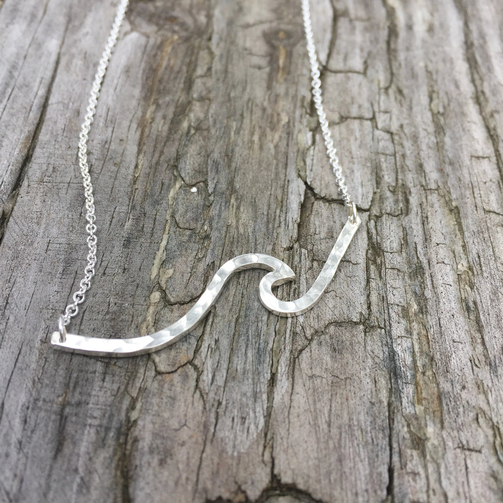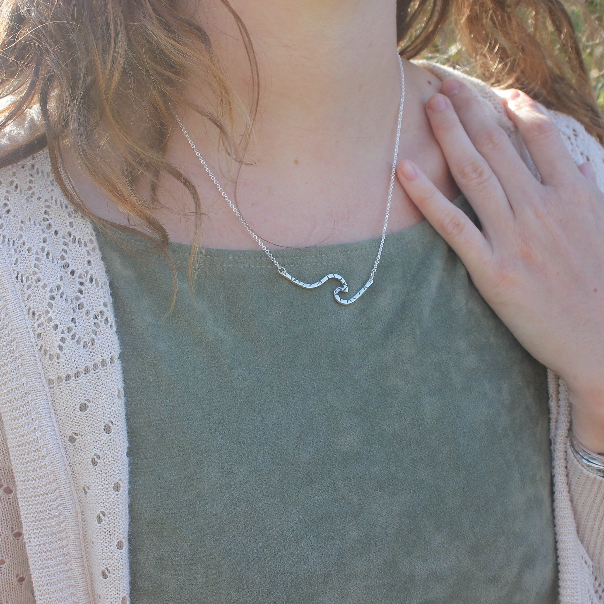 A combination of the Markings Necklace and a Wave Necklace makes a great combination! A favorite, this necklace is handmade from Argentium Silver (.930) and hand marked measuring 2 1/2 inches across. Choose markings or hammered texture. Pendant is hung from a sterling silver chain in 16" or 18". Handmade in Wellfleet, MA.