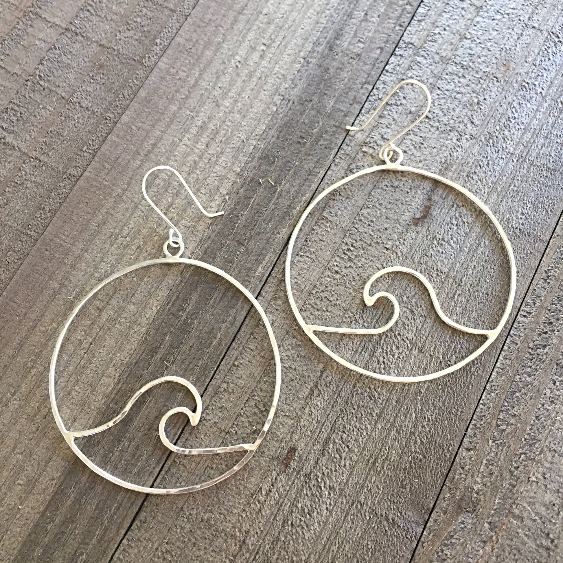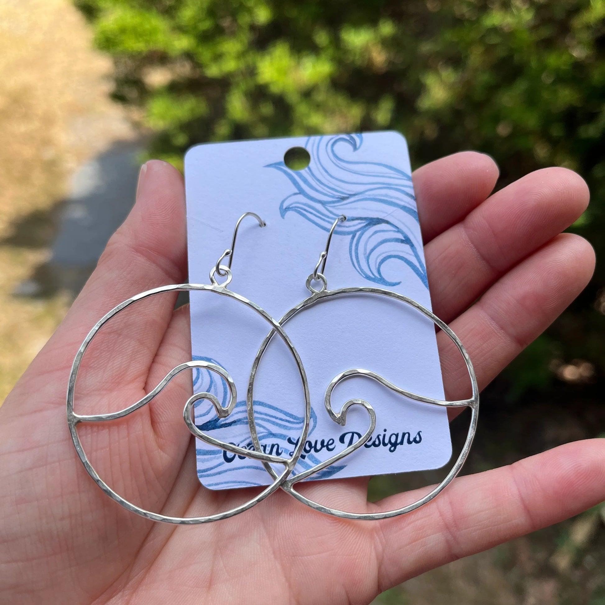 These are the biggest version of Wave Earrings I offer, each pair is handmade from 16 gauge *Argentium silver making them sturdy but light and comfortable. The hoops measure 2.25 inches in diameter and have a hammered finish making them sparkle in the light. Made in Wellfleet, MA.