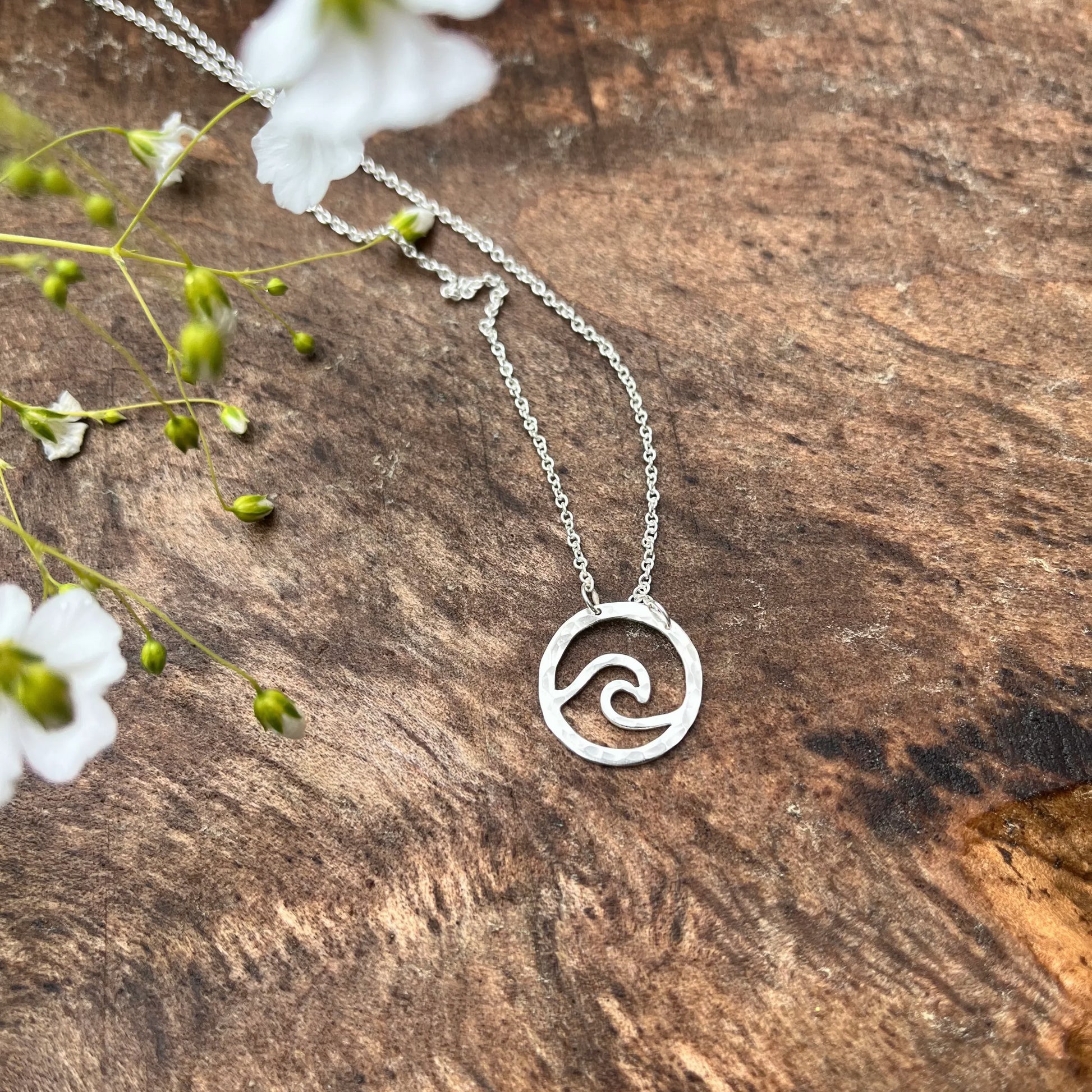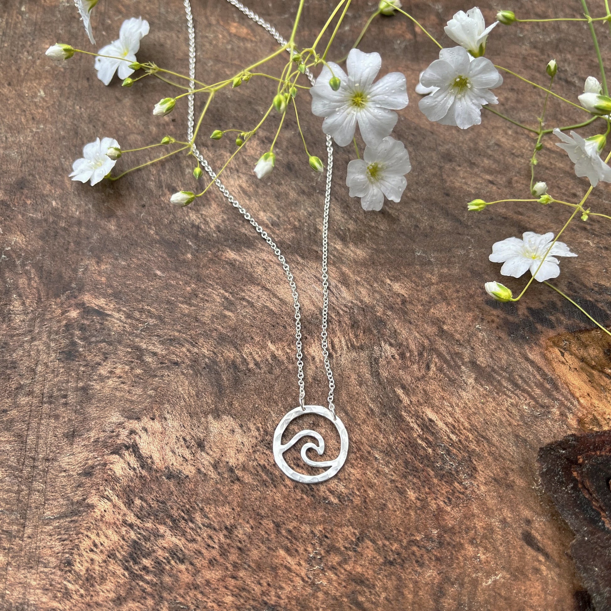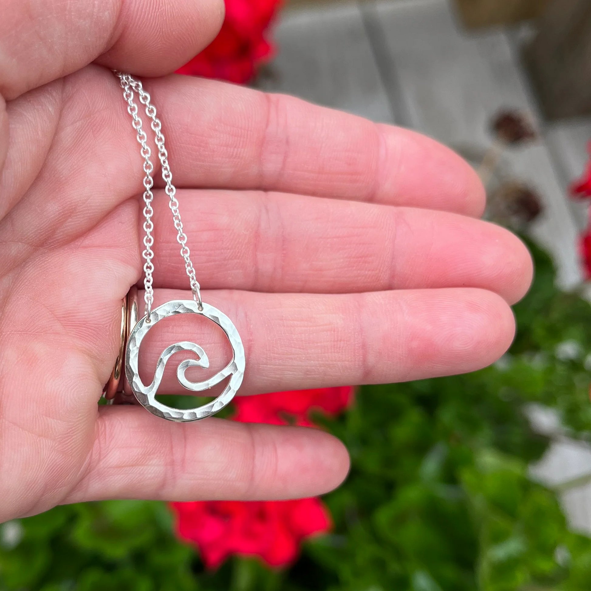 A favorite and original design, the wave necklace is sure to please! Handmade from Sterling Silver, the wave pendant is just under 3/4" in diameter and hung from a 16" or 18" sterling silver chain! Handmade by Danielle Benton in Wellfleet, MA.